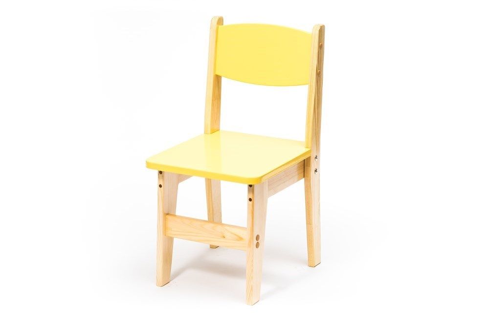 Боковые части - дерево (сосна) Сиденье и спинка - МДФ, покрытая краской. Стул имеет различные ростовые группы: 260, 300, 340
