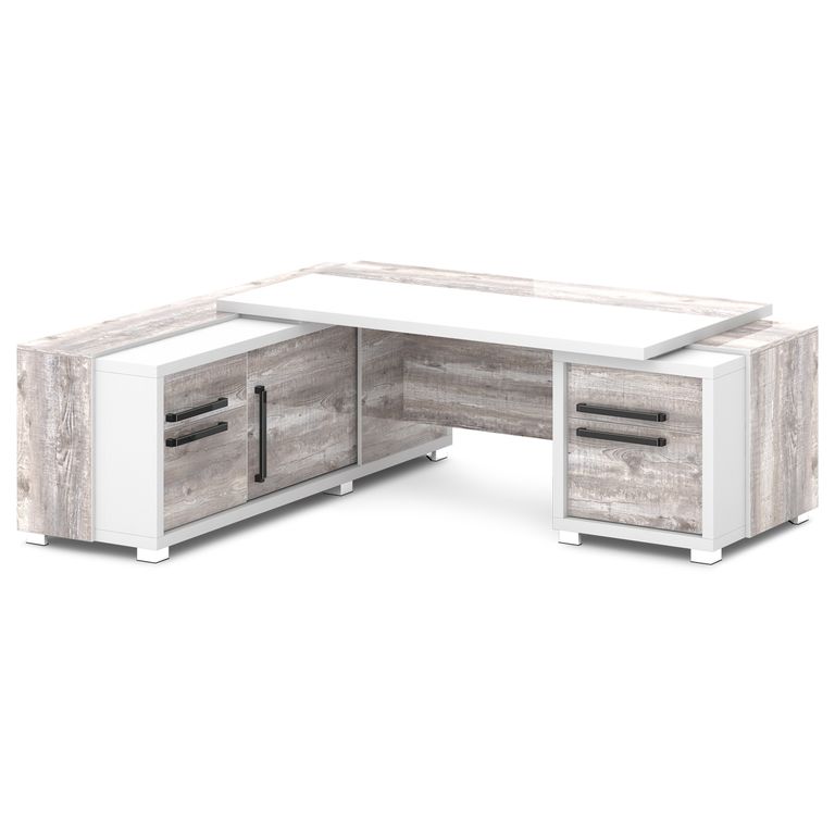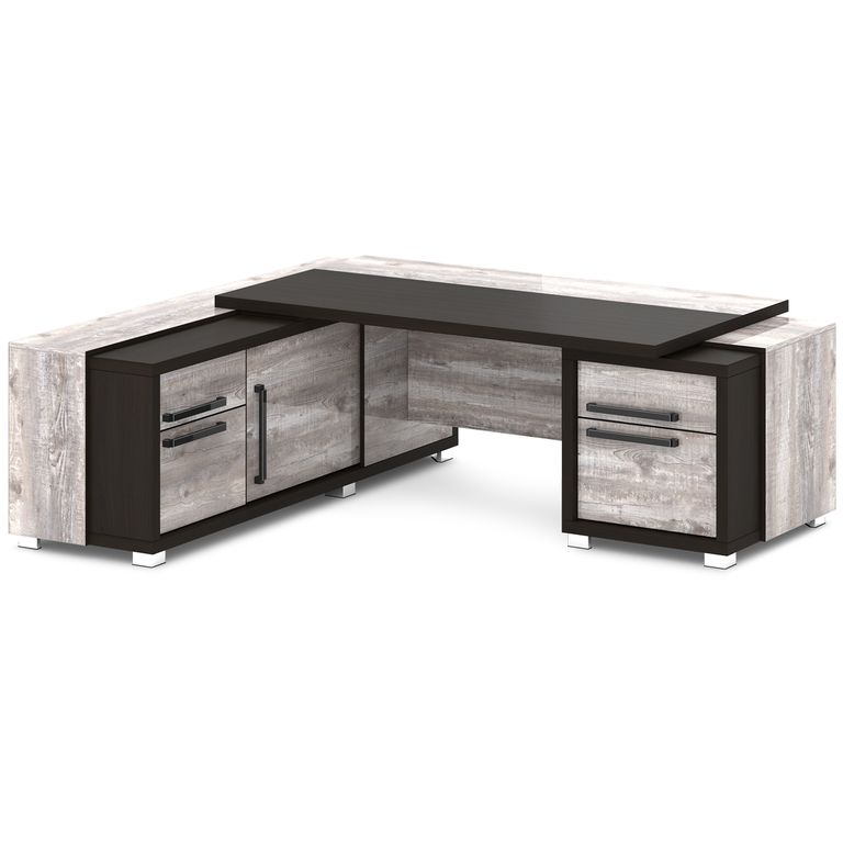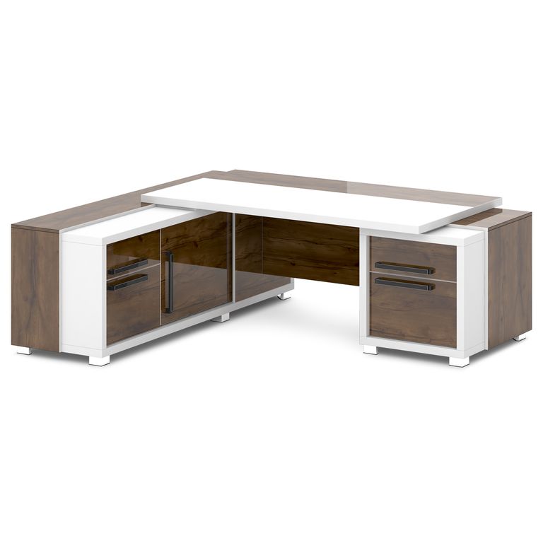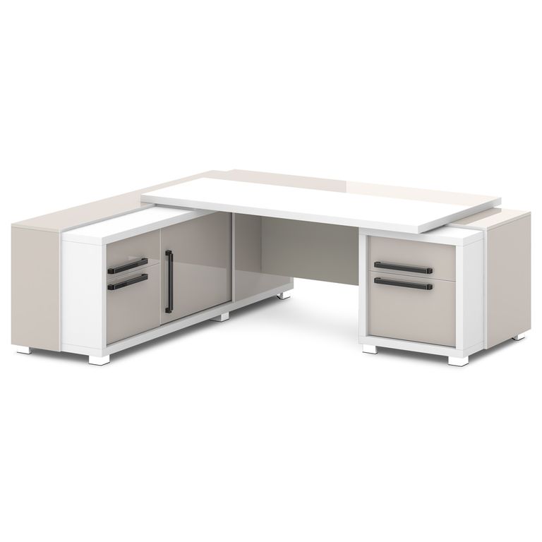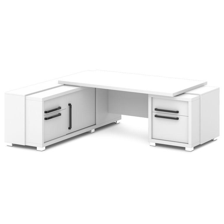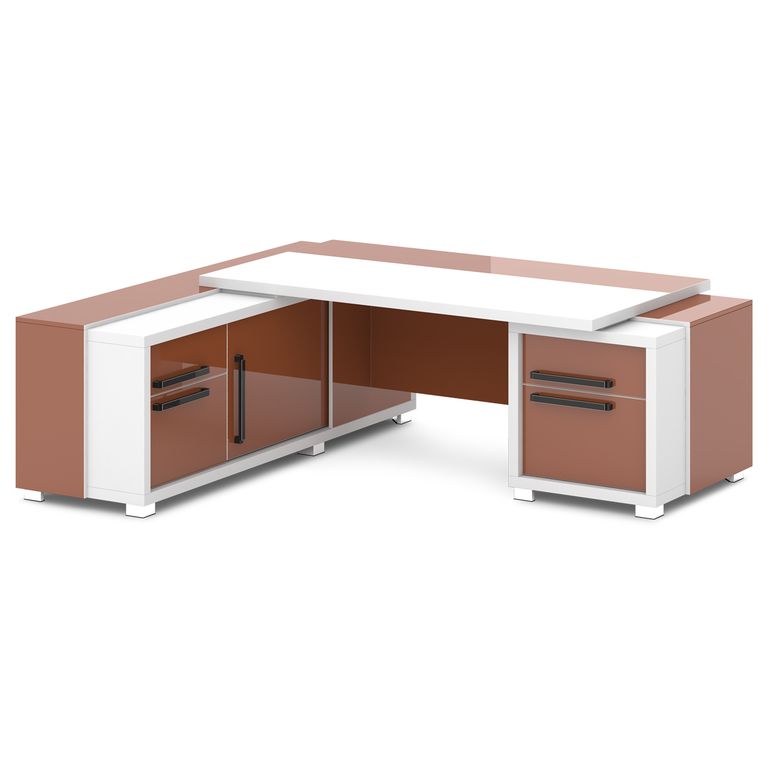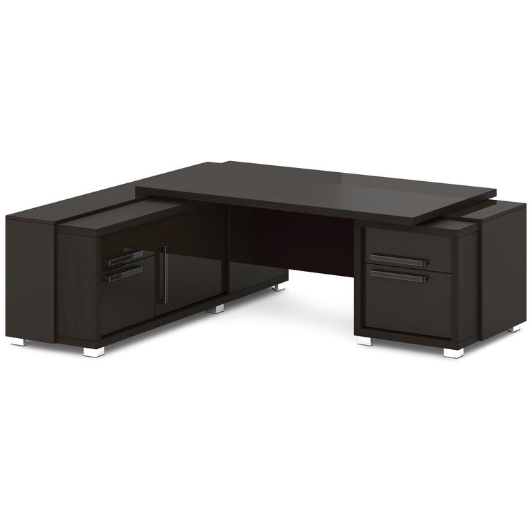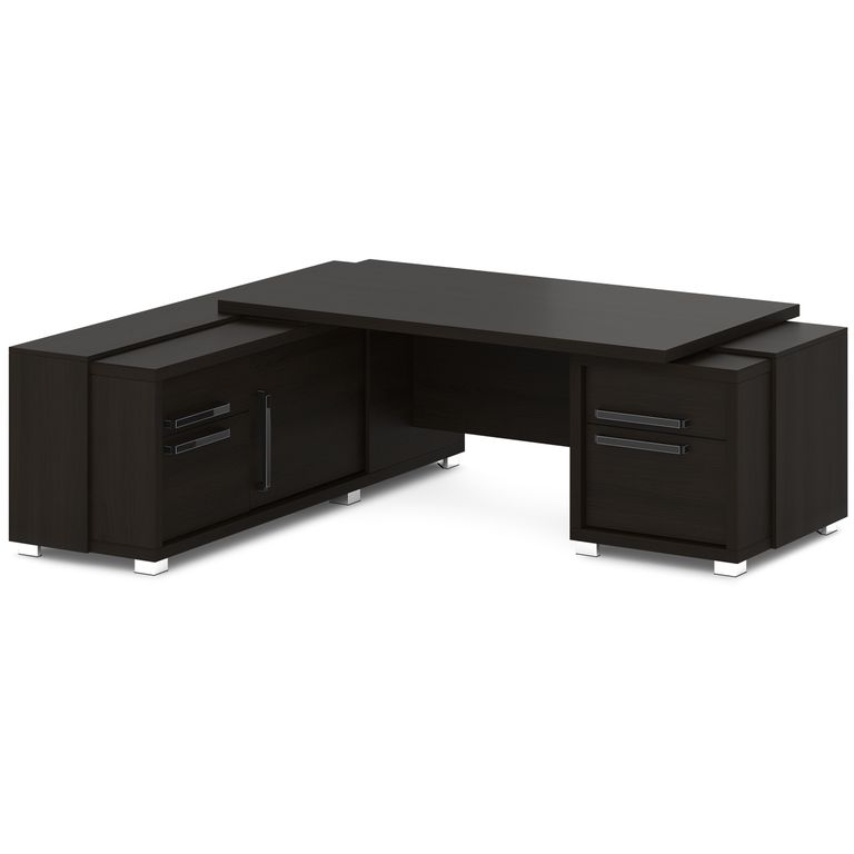 Стол руководителя с тумбой и греденцией. Размер столешницы 1800х1000 мм. Тумбы имеют по 3 ящика (2 внешних и 1 внутренний) на шариковых направляющих скрытого монтажа полного выдвижения, обладающих плавным ходом и оборудованных доводчиками. Греденция оснащена отсеком с переставной полкой или местом под сейф с дверью-купе. Размер отсека - 600х490х554 мм.