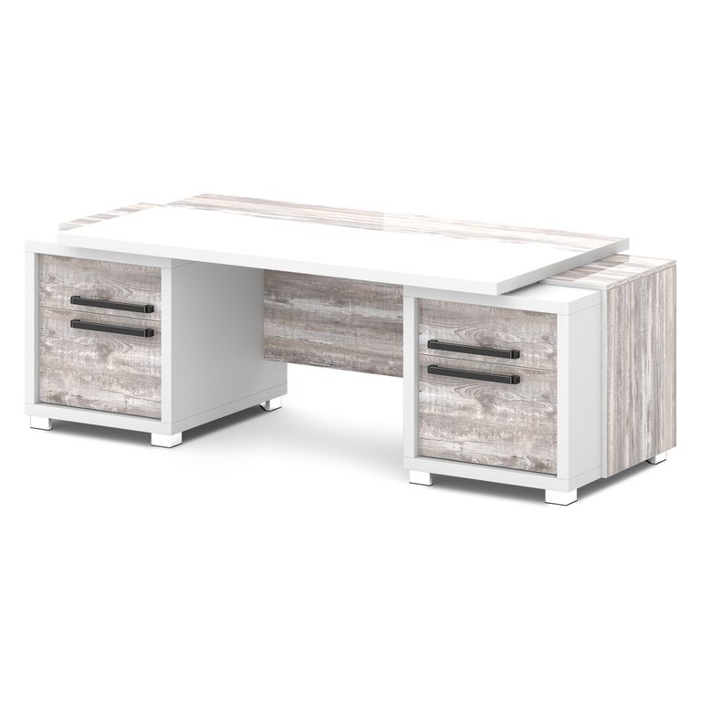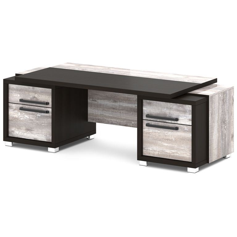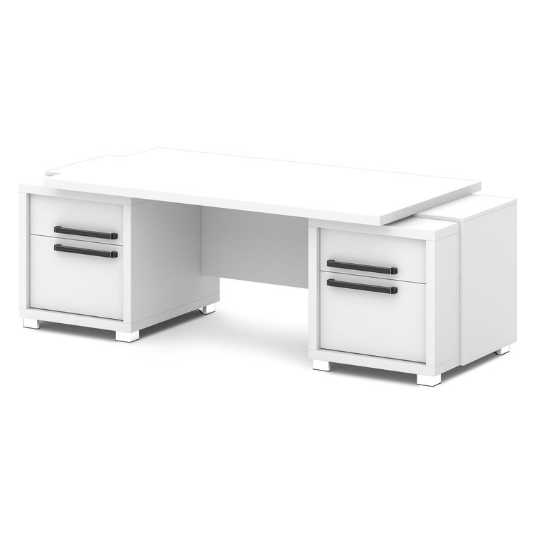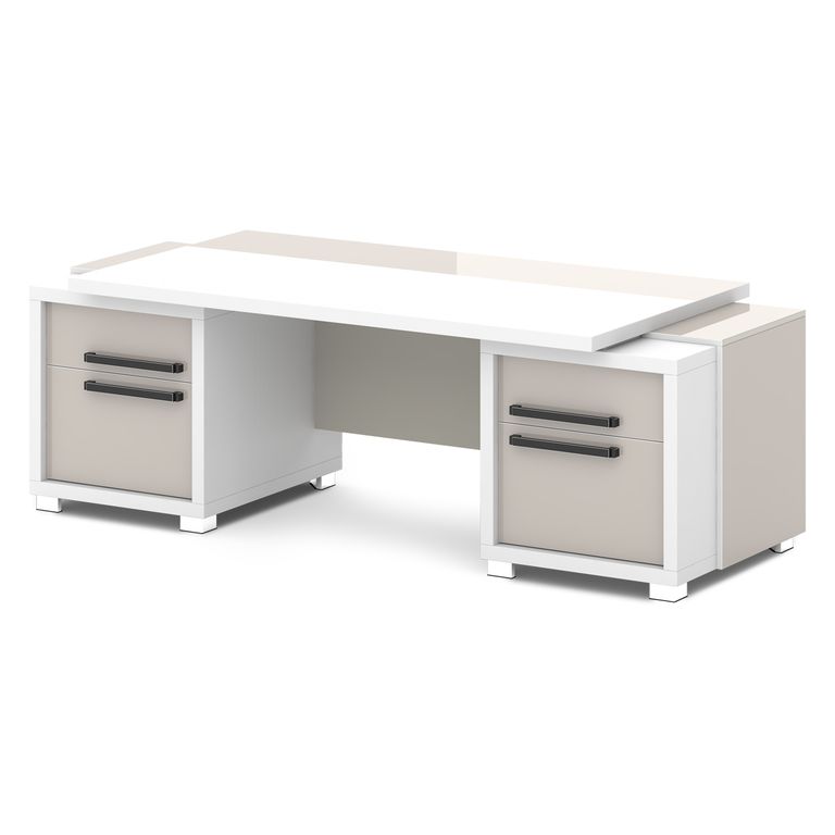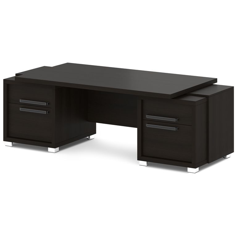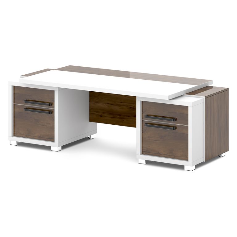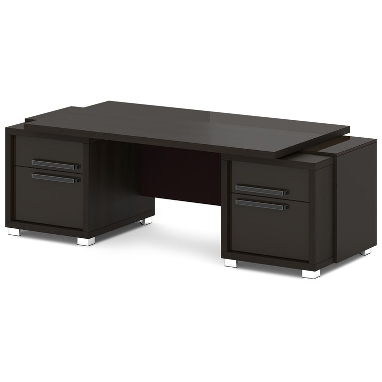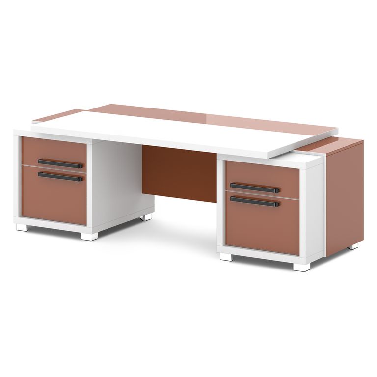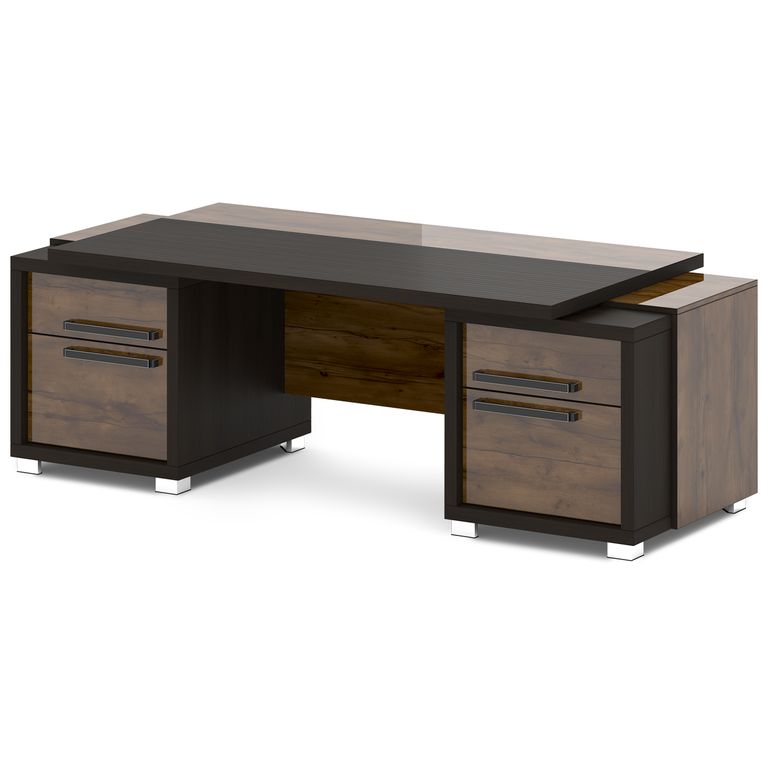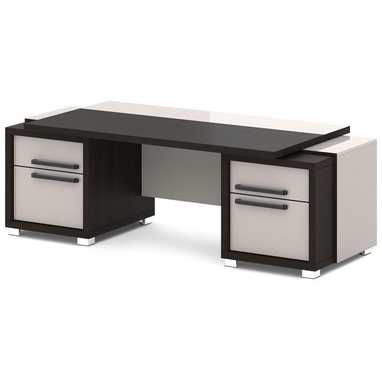 Стол руководителя с двумя тумбами. Тумбы имеют по 3 ящика (2 внешних и 1 внутренний) на шариковых направляющих скрытого монтажа полного выдвижения, обладающих плавным ходом и оборудованных доводчиками.
