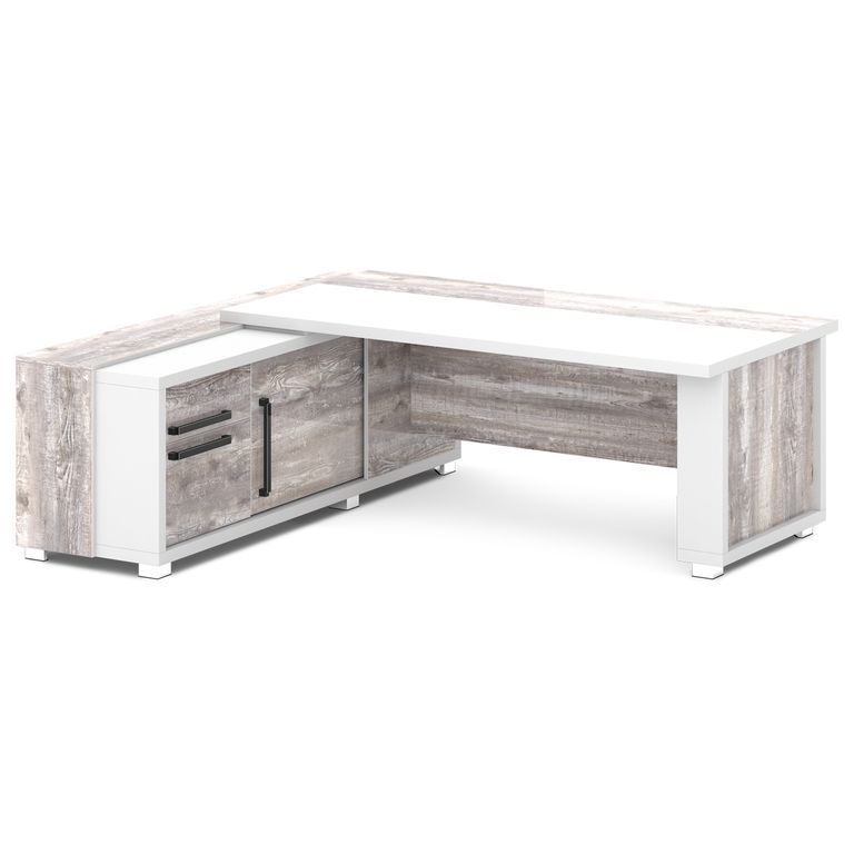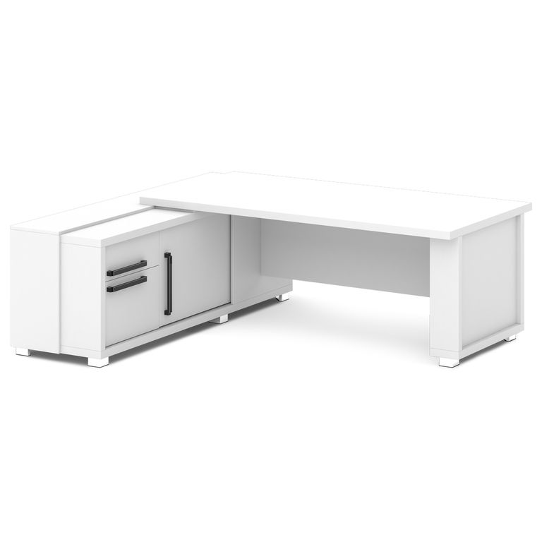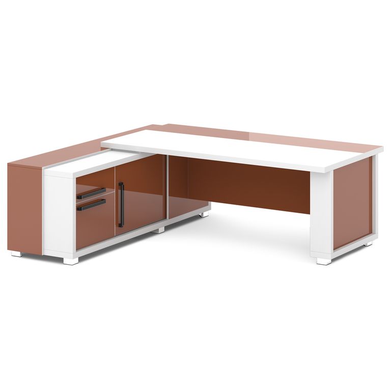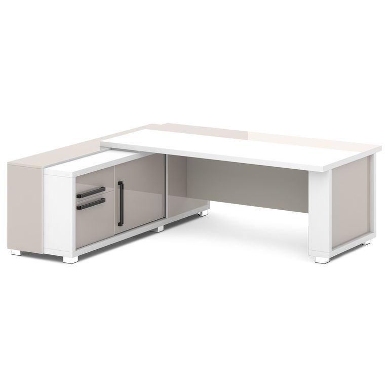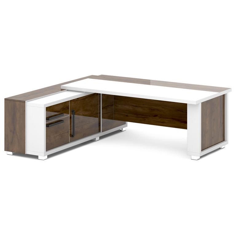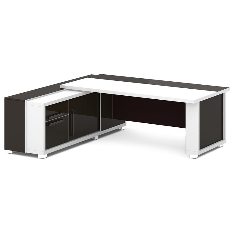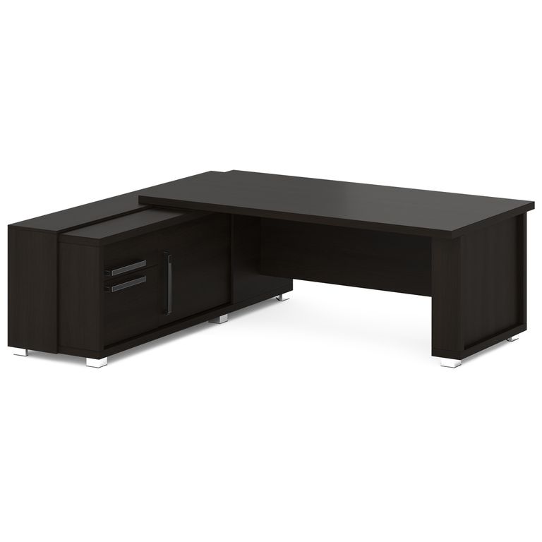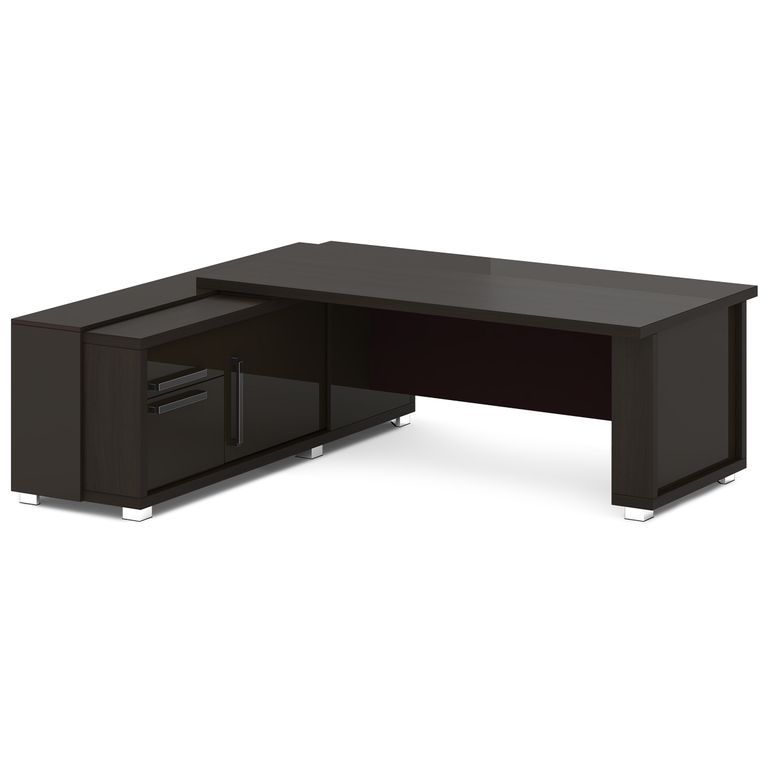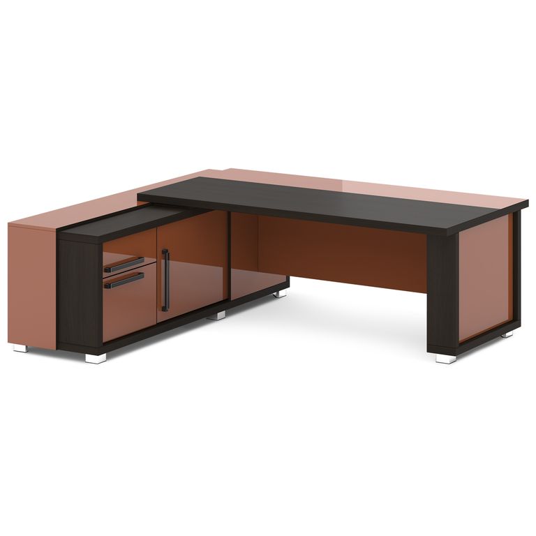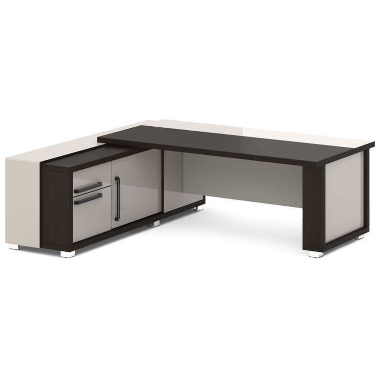 Стол руководителя с греденцией. Греденция имеет 3 ящика (2 внешних и 1 внутренний) на шариковых направляющих скрытого монтажа полного выдвижения, обладающих плавным ходом и оборудованных доводчиками. Оснащена отсеком с переставной полкой или местом под сейф с дверью-купе. Размер отсека - 600х490х554. Стол состоит из сборной опоры и тумбы-греденции, служащей опорой, столешницы и соединительного щита. Стол левый – тумба-греденция с левой стороны, сборная опора – с правой стороны. Стол правый – тумба-греденция с правой стороны, сборная опора – с левой стороны. На рис. - правый.