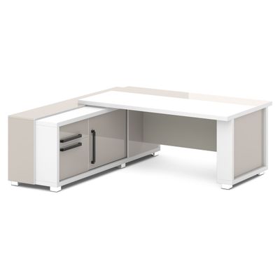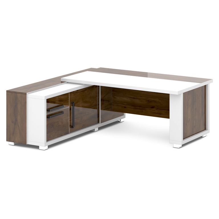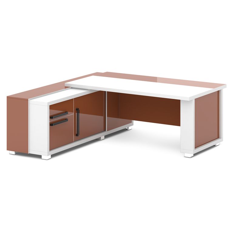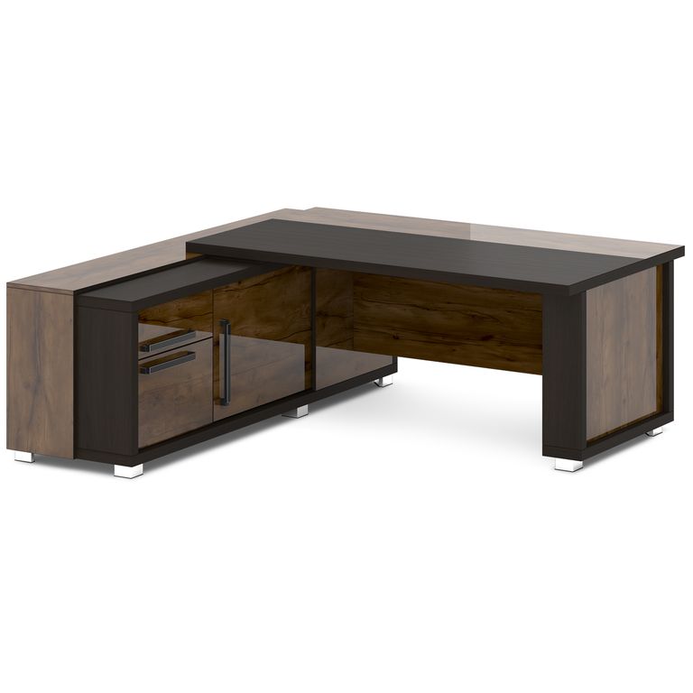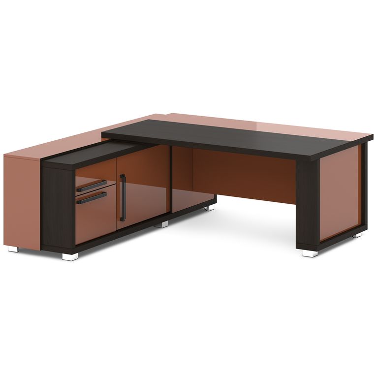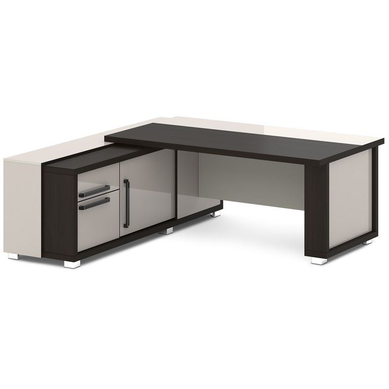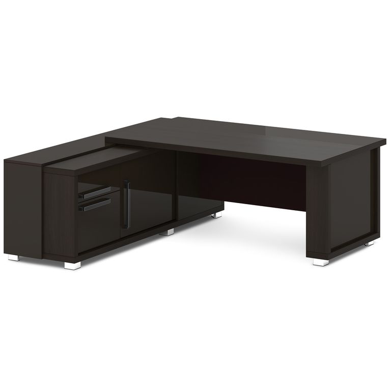 Стол руководителя с греденцией. Греденция имеет 3 ящика (2 внешних и 1 внутренний) на шариковых направляющих скрытого монтажа полного выдвижения, обладающих плавным ходом и оборудованных доводчиками. Оснащена отсеком с переставной полкой или местом под сейф с дверью-купе. Размер отсека - 600х490х554. Стол состоит из сборной опоры и тумбы-греденции, служащей опорой, столешницы и соединительного щита. Стол левый – тумба-греденция с левой стороны, сборная опора – с правой стороны. Стол правый – тумба-греденция с правой стороны, сборная опора – с левой стороны. На рис. - правый.