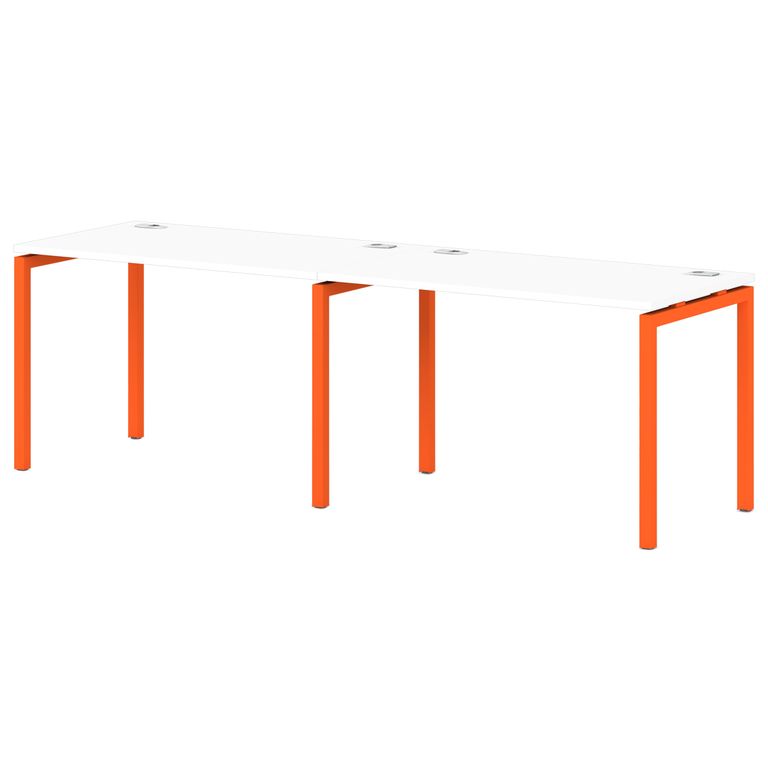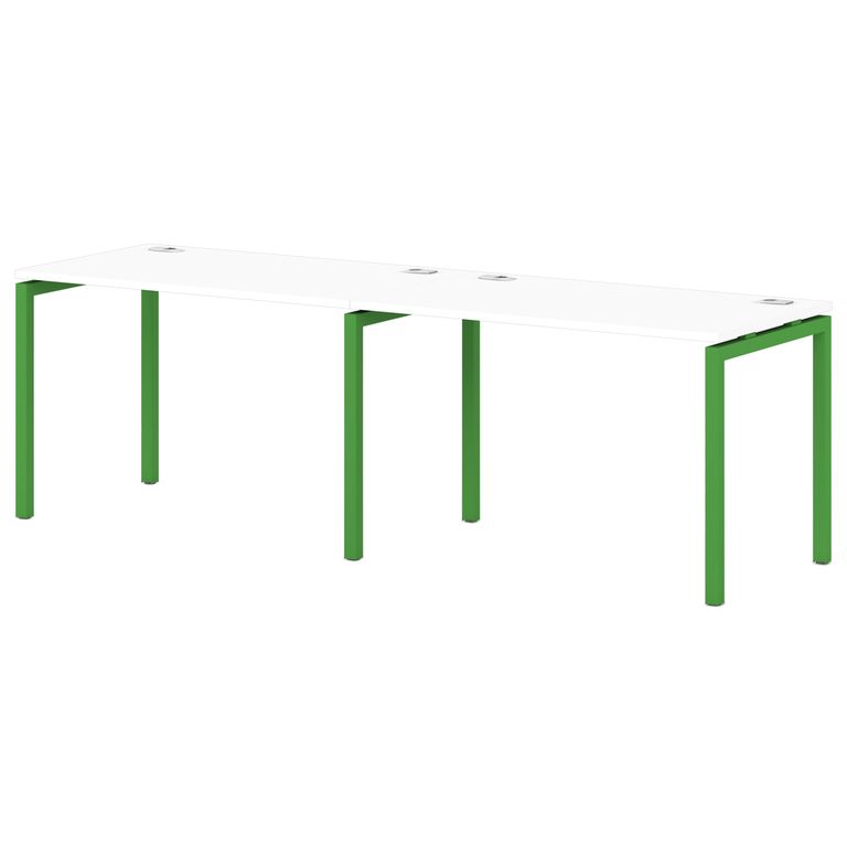 Металлокаркас представляют собой разборную, легкособираемую конструкцию, состоящую из опор и соединителей, стянутых между собой крепежными узлами. Опоры оборудованы регулировочными ножками, с возможностью регулировки по высоте. Металлокаркасы изготавливаются сечением 40х40 мм и окрашены порошковой краской в белый или серый цвет. В столешницах установлены по два кабель-канала и лоток сетчатый для проводов. Все соединительные элементы оснащены фурнитурой для многократной сборки и разборки изделия.