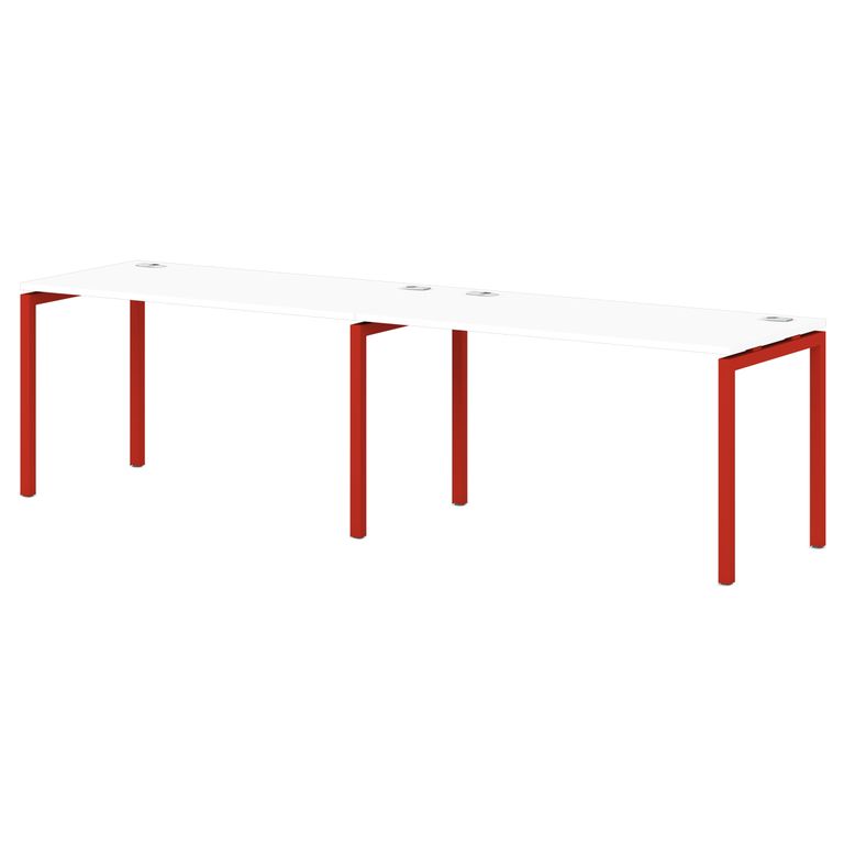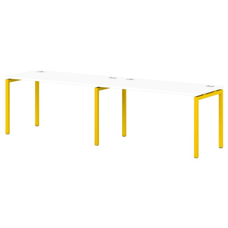 Металлокаркас представляют собой разборную, легкособираемую конструкцию, состоящую из опор и соединителей, стянутых между собой крепежными узлами. Опоры оборудованы регулировочными ножками, с возможностью регулировки по высоте. Металлокаркасы изготавливаются сечением 40х40 мм и окрашены порошковой краской в белый или серый цвет. В столешницах установлены по два кабель-канала и лоток сетчатый для проводов. Все соединительные элементы оснащены фурнитурой для многократной сборки и разборки изделия.