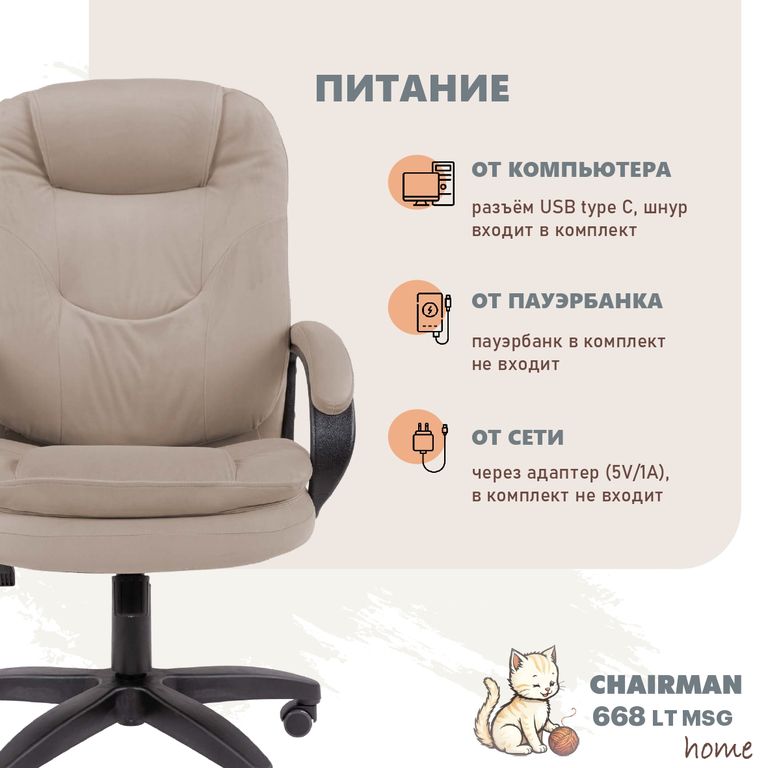 6 точек, 5 режимов и 3 уровня интенсивности массажа. Управление – с удобного пульта, питание – через USB (от компьютера, пауэрбанка или от сети через адаптер). И всё это – в корпусе мягкого, удобного и, что немаловажно, надёжного кресла.