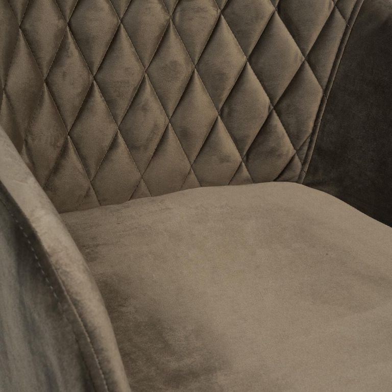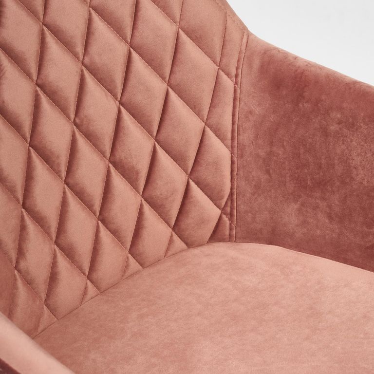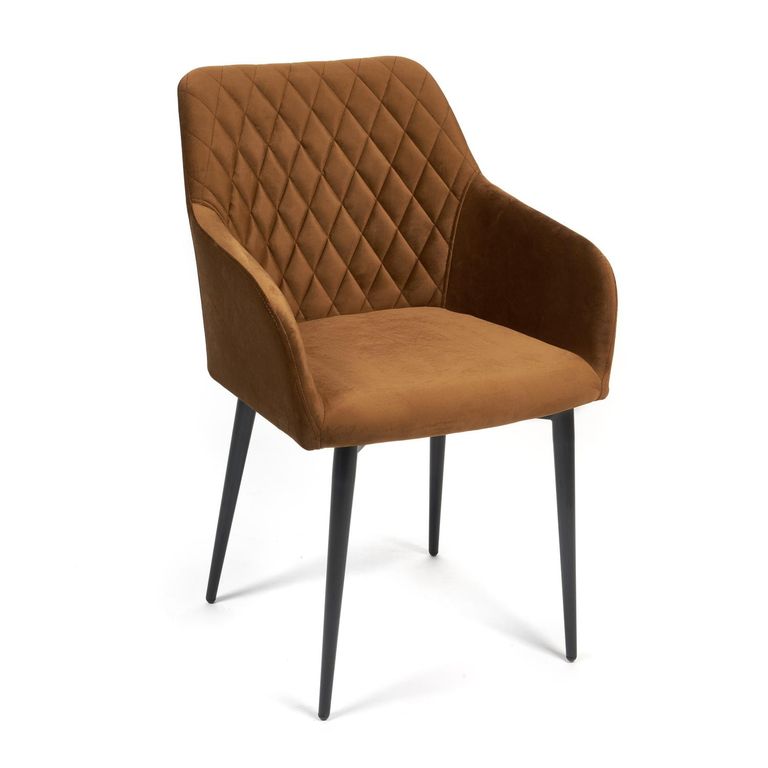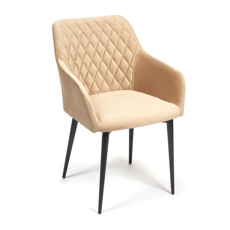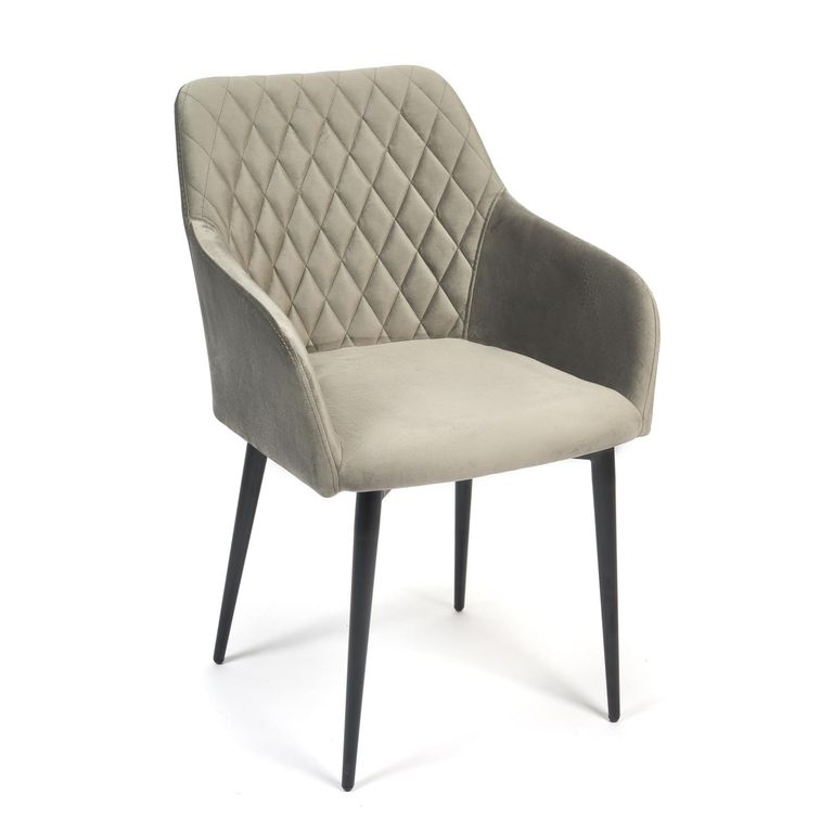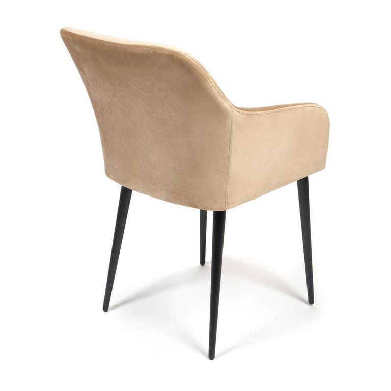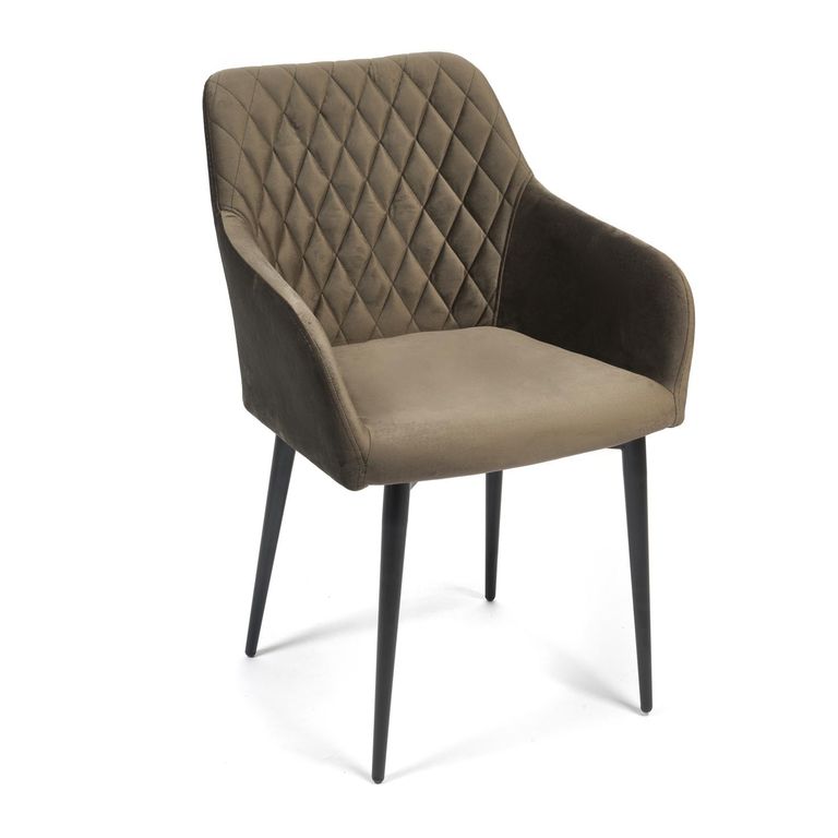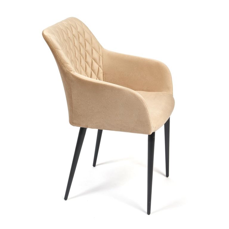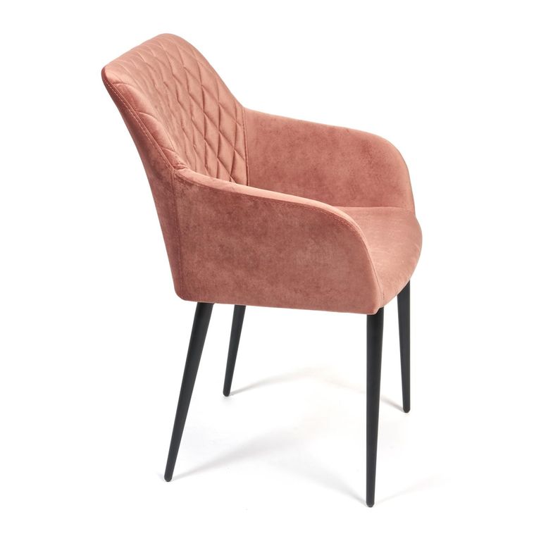 Стул на комбинированном каркасе из сочетания многослойной фанеры толщиной 10 мм (в сидении) и металлического основания (в спинке). Наполнение - комбинация пенополиуретанов различной плотности. Обивочный материал – велюр, с мягкой бархатистой текстурой. Ромбовидная отстрочка внутренней части спинки. Ножки из металла с порошковым покрытием и пластиковыми подпятниками.