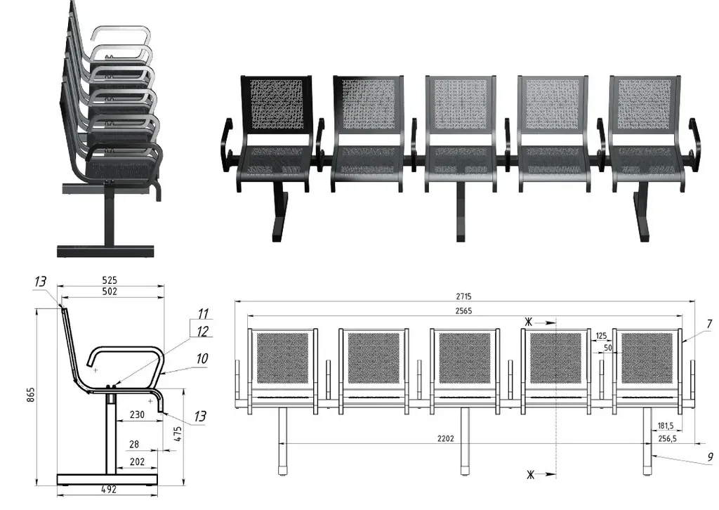 Многоместная секция из пяти стульев, Неразборная перфорированная секция из квадратной трубы, с высокой спинкой, с подлокотниками. Используемые материалы: Лист перфорированный 1мм. Нога 40*25*1,5мм. Балка 50*50 Размер спинки 363*300мм. Размер сиденья 363*340мм.