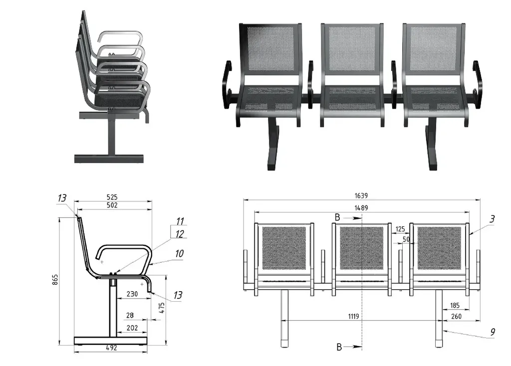 Многоместная секция из трех стульев, Неразборная перфорированная секция из квадратной трубы, с высокой спинкой, с подлокотниками. Используемые материалы: Лист перфорированный 1мм. Нога 40*25*1,5мм. Балка 50*50 Размер спинки 363*300мм. Размер сиденья 363*340мм.