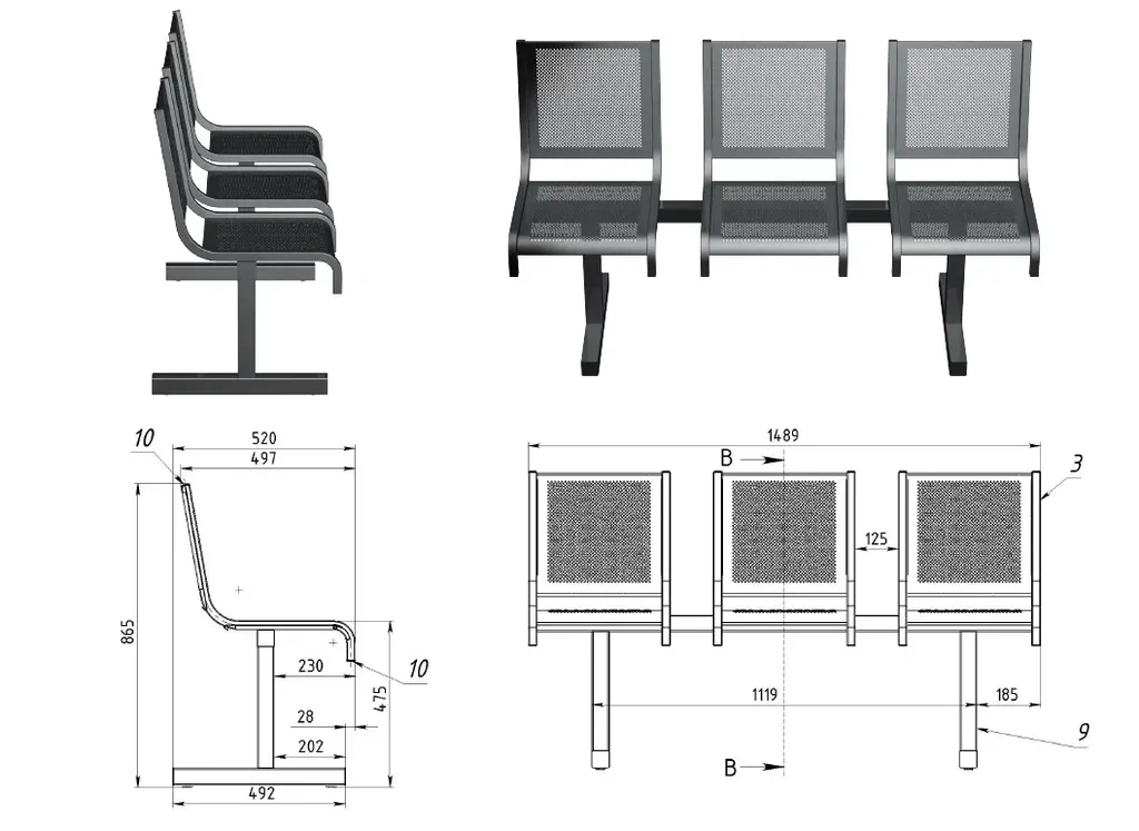 Секция из трех стульев, Неразборная перфорированная секция из квадратной трубы, с высокой спинкой, без подлокотников. Используемые материалы: Лист перфорированный 1мм. Нога 40*25*1,5мм. Балка 50*50 Размер спинки 363*300мм. Размер сиденья 363*340мм.
