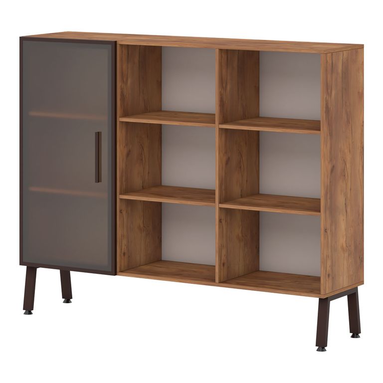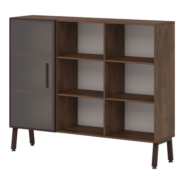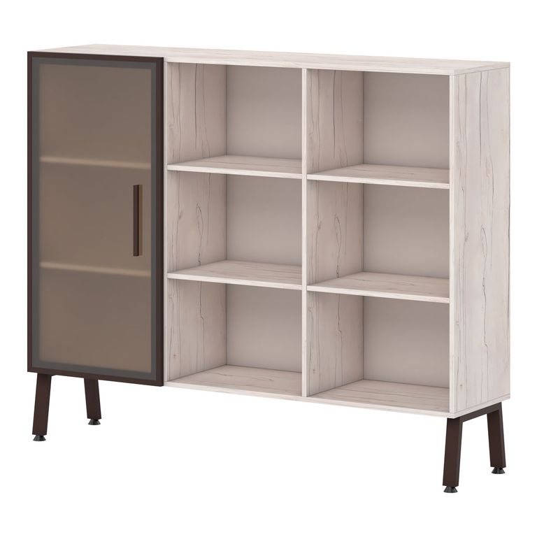 Шкафная группа предоставляет максимум возможностей: открытые стеллажи, двери со стеклом в алюминеевом профиле в цвете коньяк, выдвижные ящики - предоставляют многообразие вариантов.