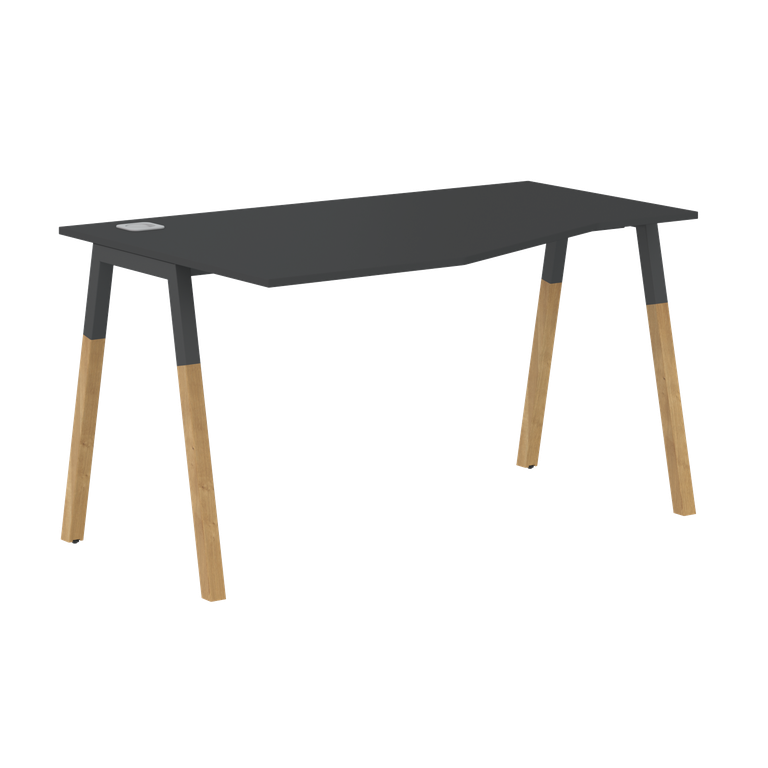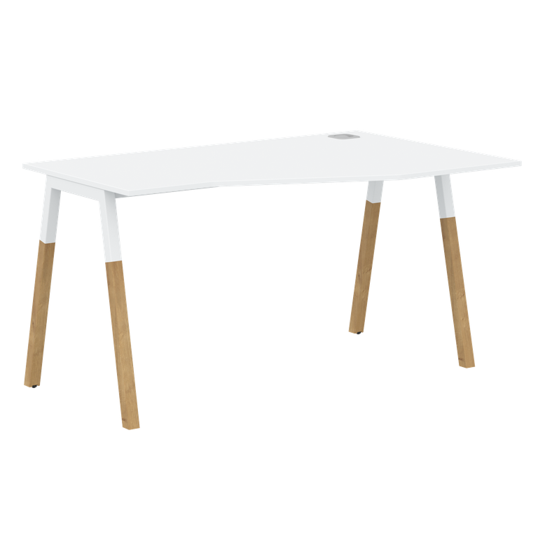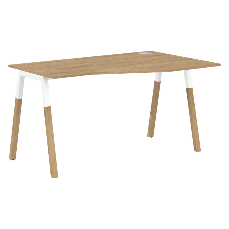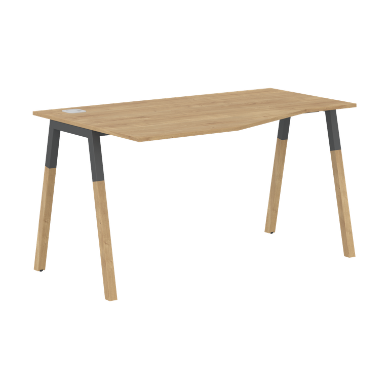 Столешница эргономичная из ЛДСП т.18мм. c кромкой ABS т.2.мм, комплектуется квадратной заглушкой кабель-канала по центру, 2-мя траверсами и комбинированными опорами А-образной формы, верхняя часть из профиля трубы 40х40мм и нижняя часть из массива бука; отделка – масло-воск. Опоры имеют регулировку внизу.