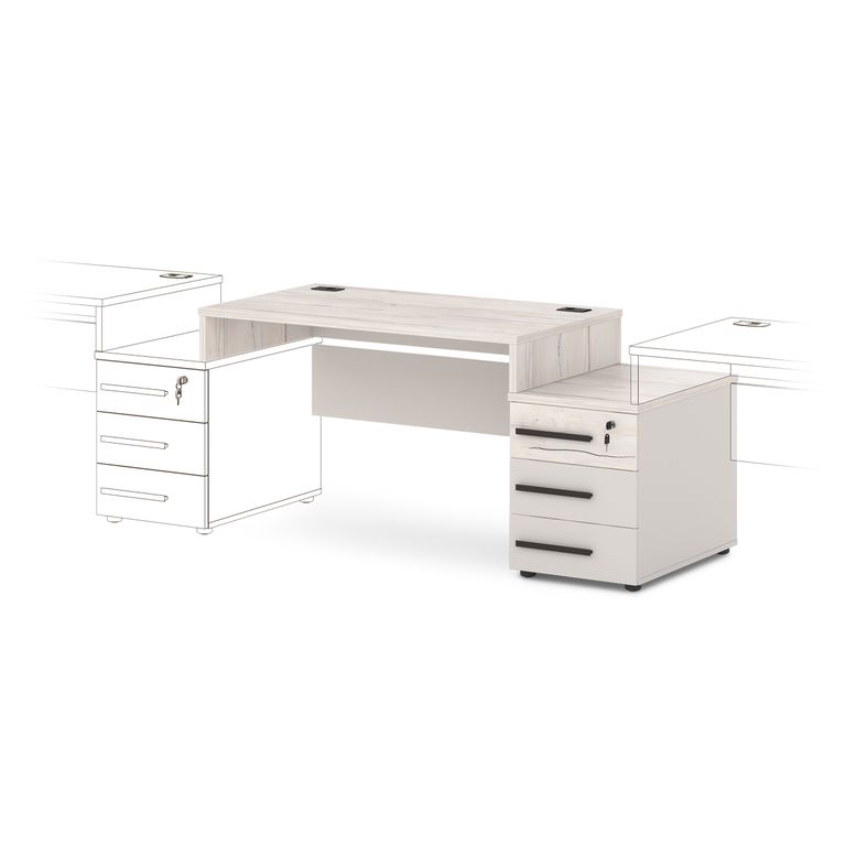Столешница изготовлена из ЛДСП 25 мм и оклеена противоударной кромкой ABS 2 мм. Бока изготовлены из ЛДСП 25 мм и оклеены противоударной кромкой ABS 2 мм и кромкой ABS 0,4 мм. Соединители изготовлены из ЛДСП 18 мм и оклеены противоударной кромкой ABS 0,4 мм. В столешнице установлены два кабель-канала. Опоры стола снабжены компенсатором неровности пола. Тумба опорная имеет три ящика на шариковых направляющих полного выдвижения с механизмом плавного закрывания. Верхний ящик оснащен замком. Верх изготовлен из ЛДСП 25 мм и оклеен противоударной кромкой ABS 2 мм. Низ, бока тумбы, бока и задние стенки ящиков изготовлены из ЛДСП 18 мм и оклеены противоударной кромкой ABS 0,4 мм. Дно ящиков ХДФ «Серое». Задняя стенка тумбы изготовлена из ЛДСП 25 мм. Фасады изготовлены из ЛДСП 18 и оклеены противоударной кромкой ABS 2 мм. Опоры тумбы снабжены компенсатором неровности пола. Все соединительные элементы оснащены фурнитурой для многократной сборки и разборки изделия. Используется фурнитура ведущих европейских производителей.