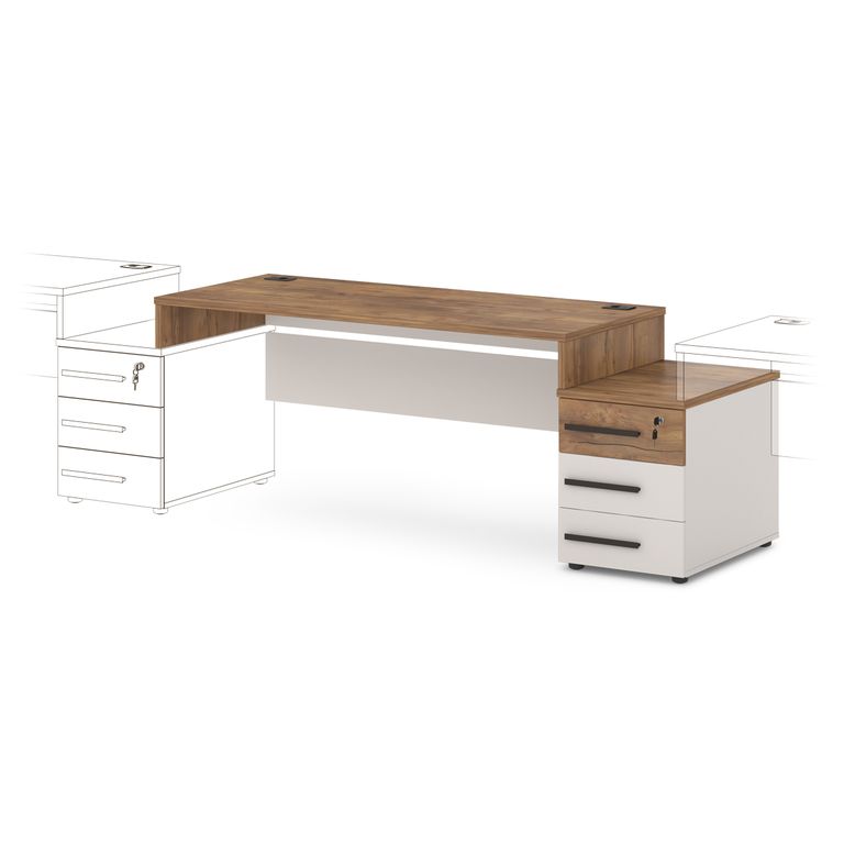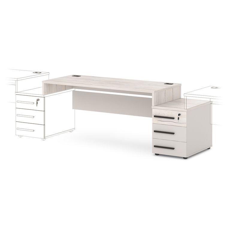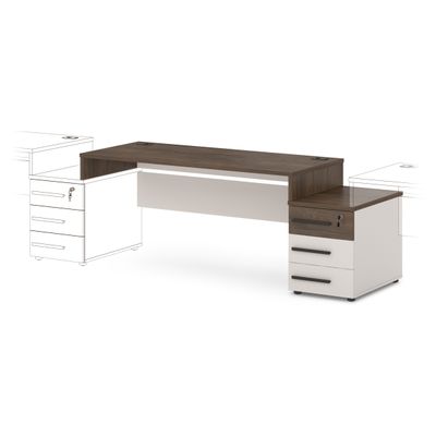 Столешница изготовлена из ЛДСП 25 мм и оклеена противоударной кромкой ABS 2 мм. Бока изготовлены из ЛДСП 25 мм и оклеены противоударной кромкой ABS 2 мм и кромкой ABS 0,4 мм. Соединители изготовлены из ЛДСП 18 мм и оклеены противоударной кромкой ABS 0,4 мм. В столешнице установлены два кабель-канала. Опоры стола снабжены компенсатором неровности пола. Тумба опорная имеет три ящика на шариковых направляющих полного выдвижения с механизмом плавного закрывания. Верхний ящик оснащен замком. Верх изготовлен из ЛДСП 25 мм и оклеен противоударной кромкой ABS 2 мм. Низ, бока тумбы, бока и задние стенки ящиков изготовлены из ЛДСП 18 мм и оклеены противоударной кромкой ABS 0,4 мм. Дно ящиков ХДФ «Серое». Задняя стенка тумбы изготовлена из ЛДСП 25 мм. Фасады изготовлены из ЛДСП 18 и оклеены противоударной кромкой ABS 2 мм. Опоры тумбы снабжены компенсатором неровности пола. Все соединительные элементы оснащены фурнитурой для многократной сборки и разборки изделия. Используется фурнитура ведущих европейских производителей.
