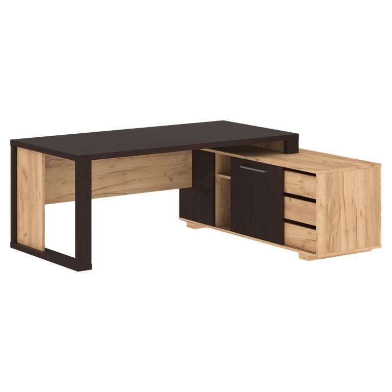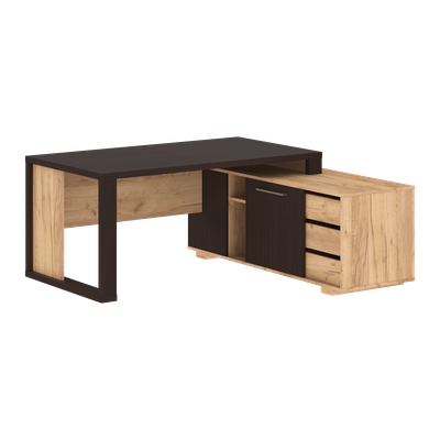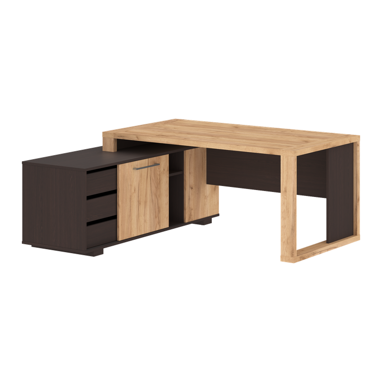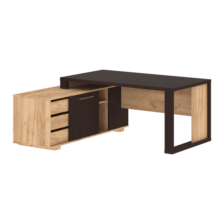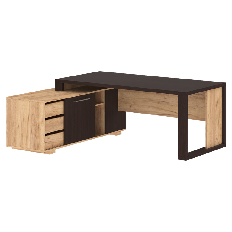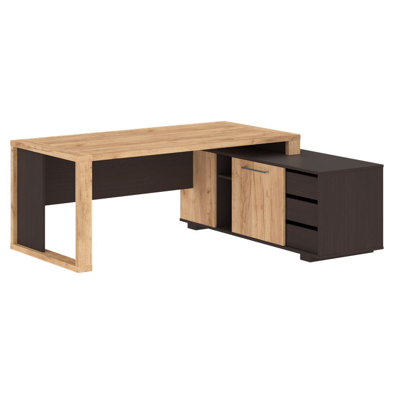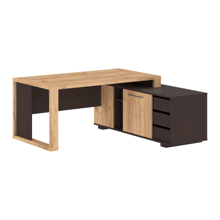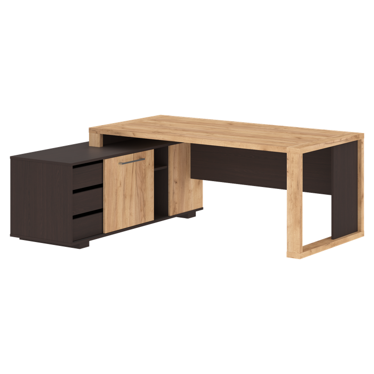 Фронтальная панель короткая. Стол имеет несущую тумбу с ящиками, открытой нишей и слайд дверью. Декоротивные вставки в боковых опорах. Габарит тумбы уменьшенный.
