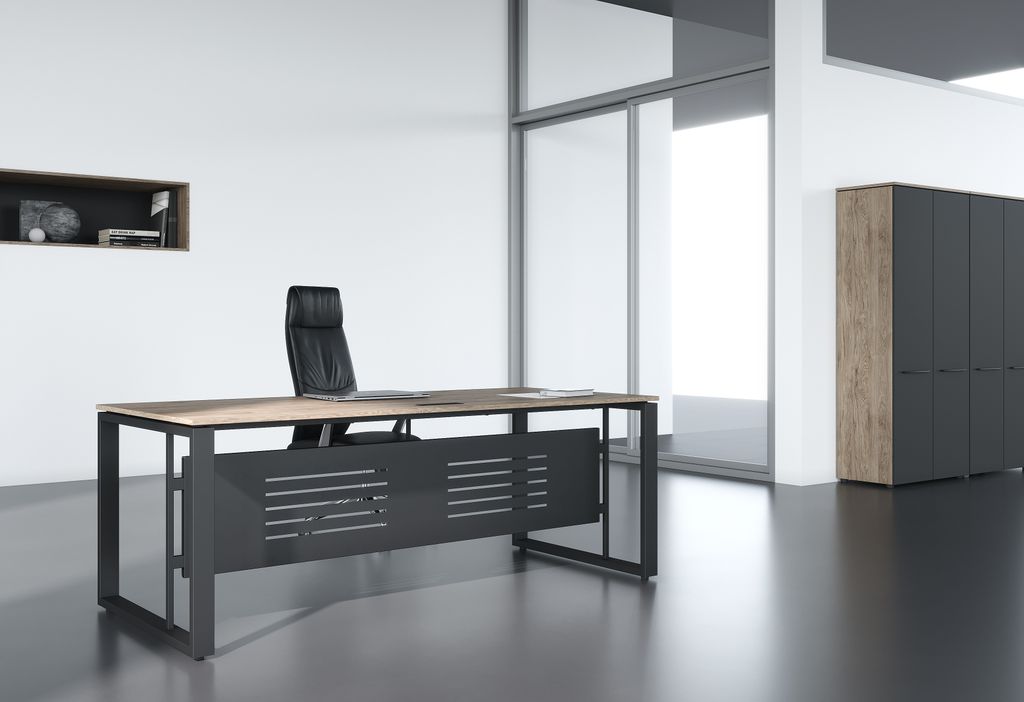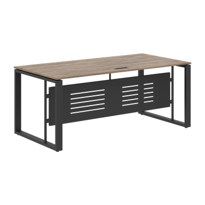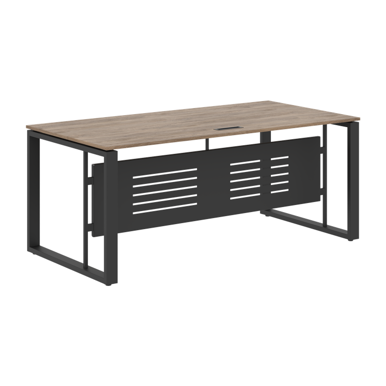 Столешница из ЛДСП т.18мм с кромкой ПВХ по периметру т.2мм, комплектуется заглушкой к/к черного цвета 180х51мм. Металлокаркас - опоры О-образной формы из профиля трубы 70х30х1,5, цвет - Антрацит, с регулировкой по высоте. Две траверсы металлические крашенные из профиля трубы 40х25х2мм. Стол комплектуется короткой фронтальной панелью из металлического листа толщиной 1,5мм с перфорацией, h=400мм. Крепление фронтальной панели при помощи кронштейнов к опоре стола. Столы рекомендуем комплектовать подвесными металлическими кабель-каналами МК-0140(S), 0160(S) и 0180(S)