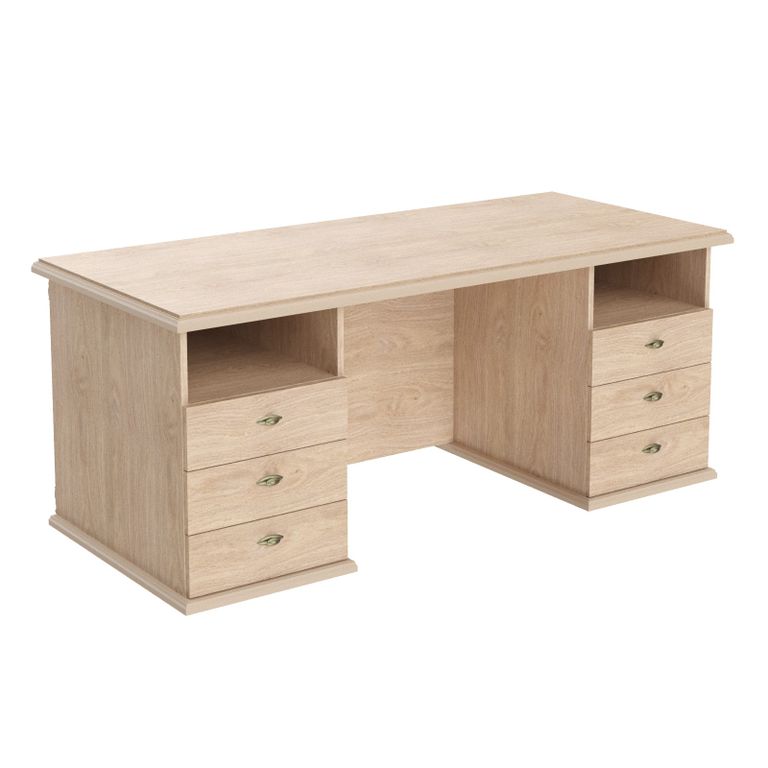 Столешница выполнена из ЛДСП с крашенным рамочным фрезерованным профилем из МДФ. Фронтальная панель с крашенной раскладкой из МДФ. Каркас тумб из ЛДСП, ящики-фолдинги размером 400х339х400, основание каркаса тумб - рамочное крашенное МДФ.