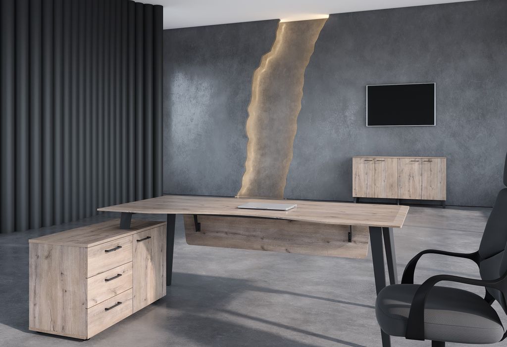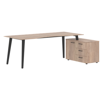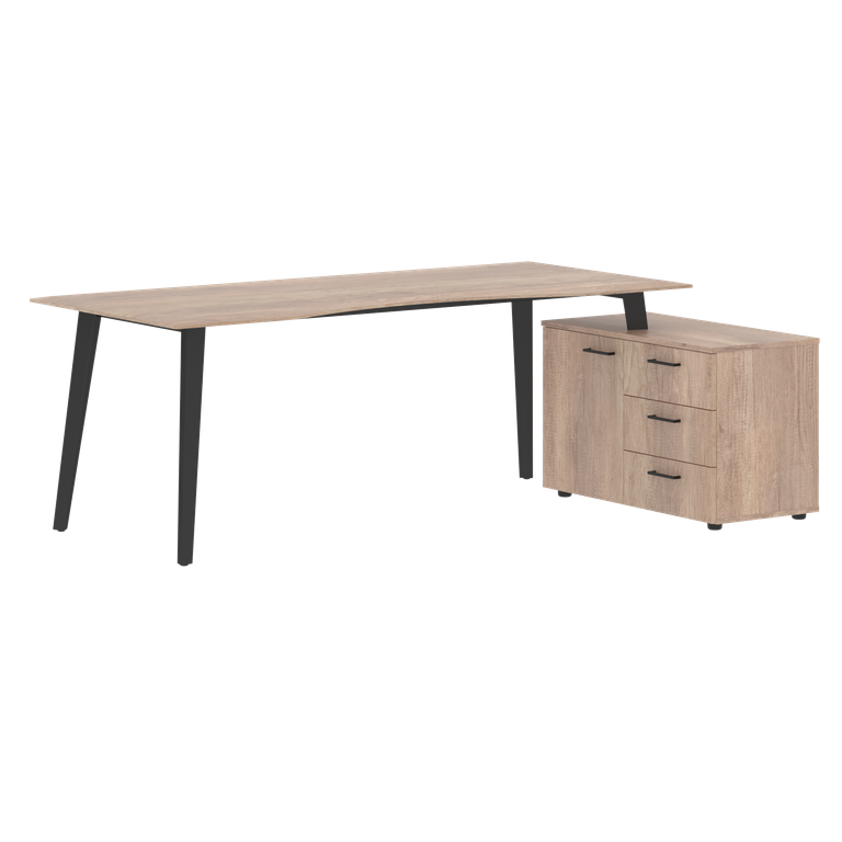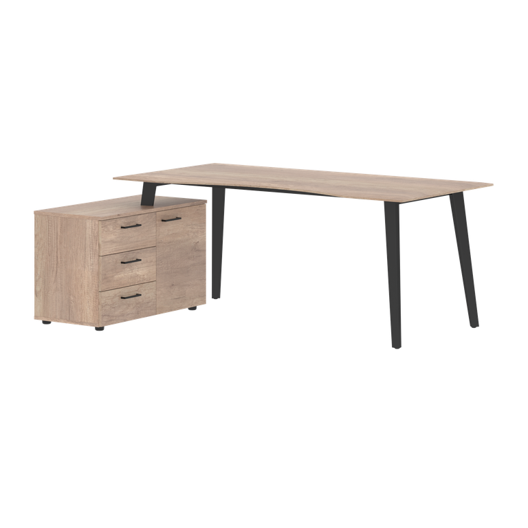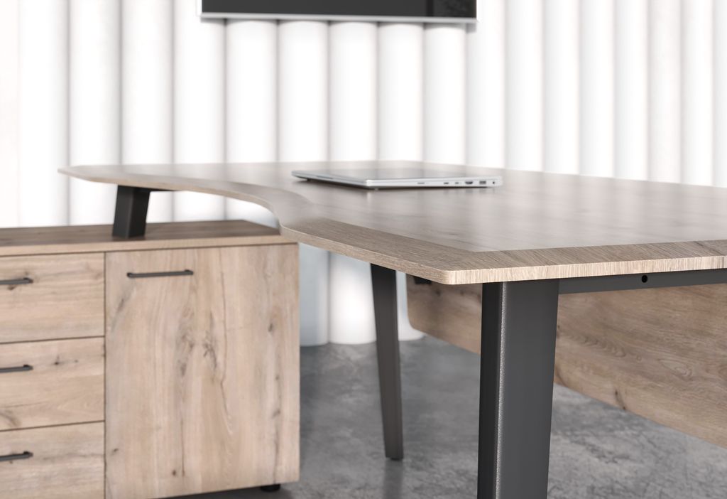 Столешница эргономичная из одностороннего МДФ т. 19мм в пленке ПВХ с фрезеровкой по периметру, цвет - Дуб Каньон. Комплектуется приставной тумбой и металлическими опорами треугольно-конической формы с траверсами рамочного соединения, цвет опор - Антрацит. Тумба из ЛДСП в цвете Дуб Каньон, имеет две секции: секция с полкой и глухой дверью, секция с 3-мя ящиками-фолдингами.