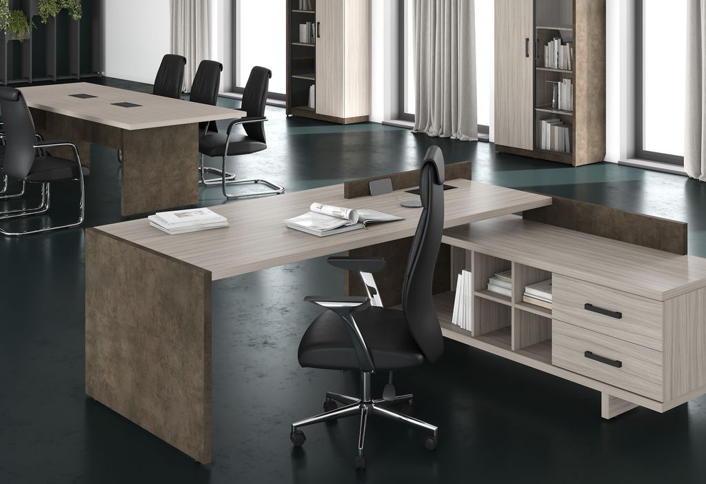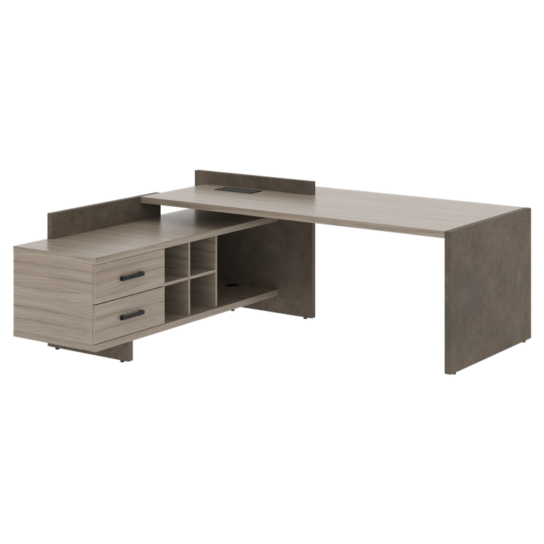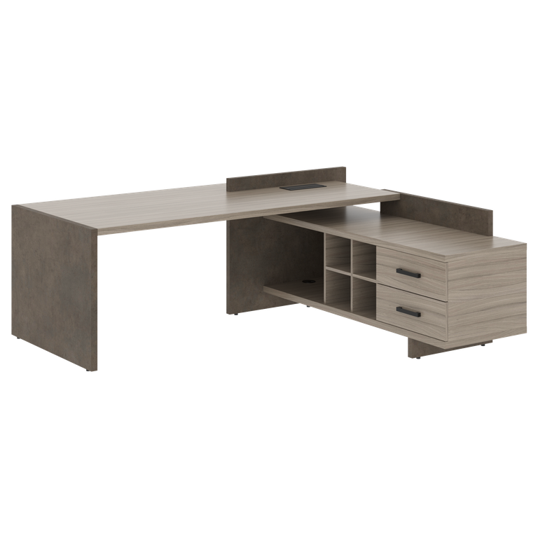 Цвета: Столешница, полка с фронтальной стороны стола, каркас тумбы, фасады ящиков тумбы - Дрифтвуд. Опоры стола, декоративный бортик и цоколь тумбы - Бетон Чикаго темный.
