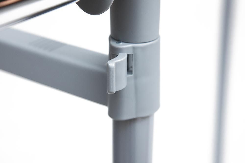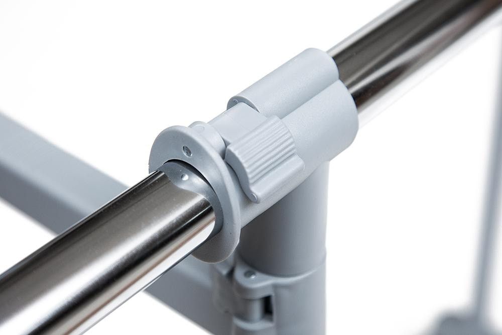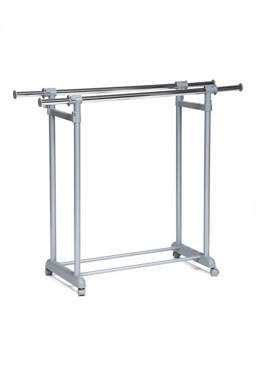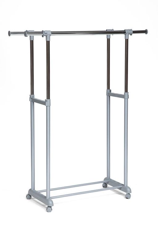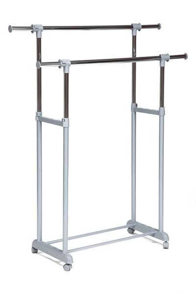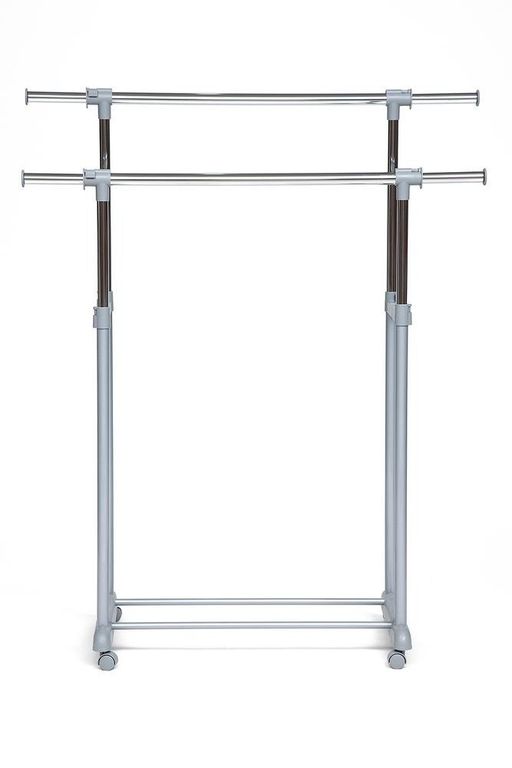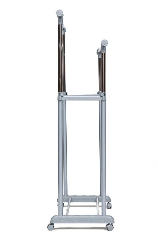 Хромированная вешалка двойная для гардеробной комнаты, офисов, салонов раздвигается по высоте, оборудована колёсиками для свободного передвижения по гардеробной комнате.
